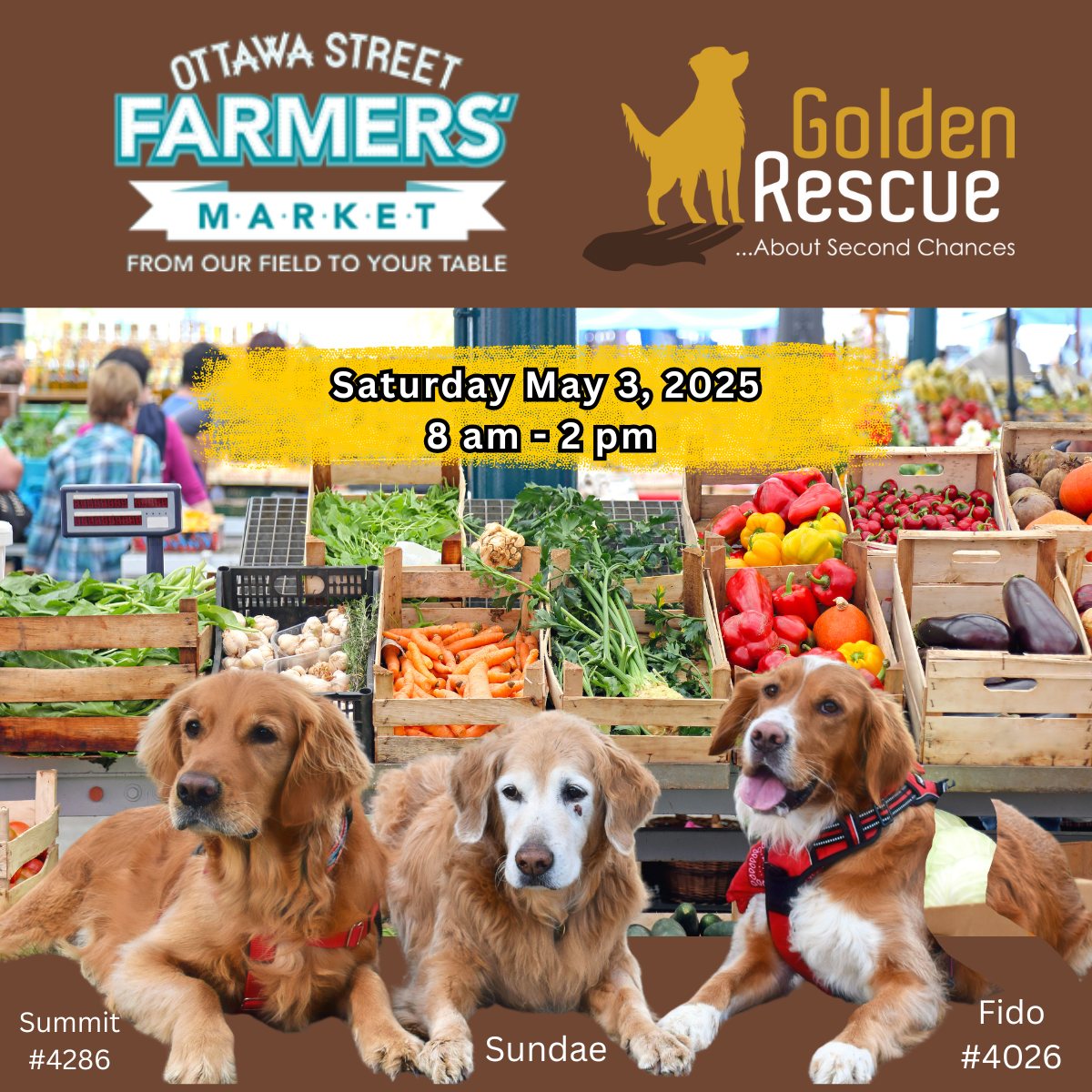 Stop by and support Golden Rescue, while shopping for all your fresh local food. Located in the heart of the Ottawa Street Shopping District in Hamilton, you will find freshly grown fruit and vegetables, as well as fish, meat & cheese, artisan breads and desserts, VQA wine, local raw honey, prepared foods, gourmet dog treats, and natural skin care products. All of the vendors at the Ottawa Street Farmers’ Market are located within 100km of the market and all are dedicated to bringing you the best and freshest products!