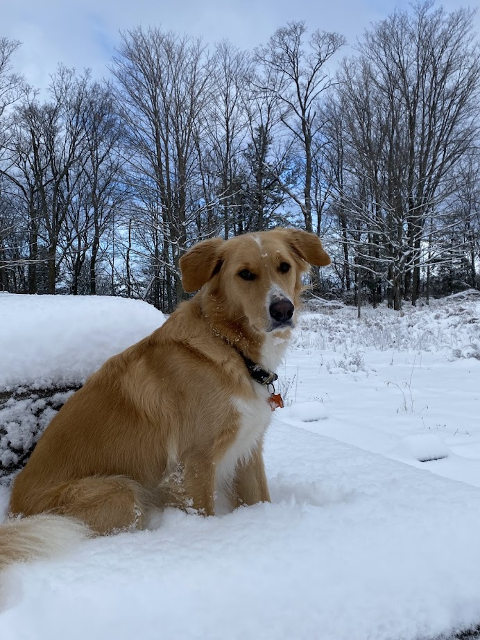 Brogan is now 3.5 and calmer but still very enthusiastic about life in general. He makes us smile all the time. Brogan loves the outdoors and is content in any weather, although the lake calls him when the hot weather hits. Brogan is half Golden and half white Shepherd. He looks mostly like a Golden…with more white patches, a bit of a curl to his long tail, longer legs, and a somewhat longer face and snout. We think he’s very handsome. Brogan loves people and still finds it really hard to be calm when he greets anyone visiting the house. The fuss lasts only a minute or two and is slowly getting better. He is otherwise well-behaved and smart so training has been fairly easy with good results. We’re told that it’s the Shepherd in Brogan that makes him SO vocal ~ not as a barker so much but just generally in expressing himself. He’s certainly the most talkative dog we’ve ever had. Bob and I foster for GR and we are able to offer a friendly buddy for our fosters. Brogan is very good at guiding fosters into their new life and they often learn as much from Brogan as they do from us. One of our recent fosters even learned from Brogan how to ring the bells on the back door to signal to us that she wants out! We’ve also noticed that Brogan is protective of the fosters and seems to know that they need a little extra attention.