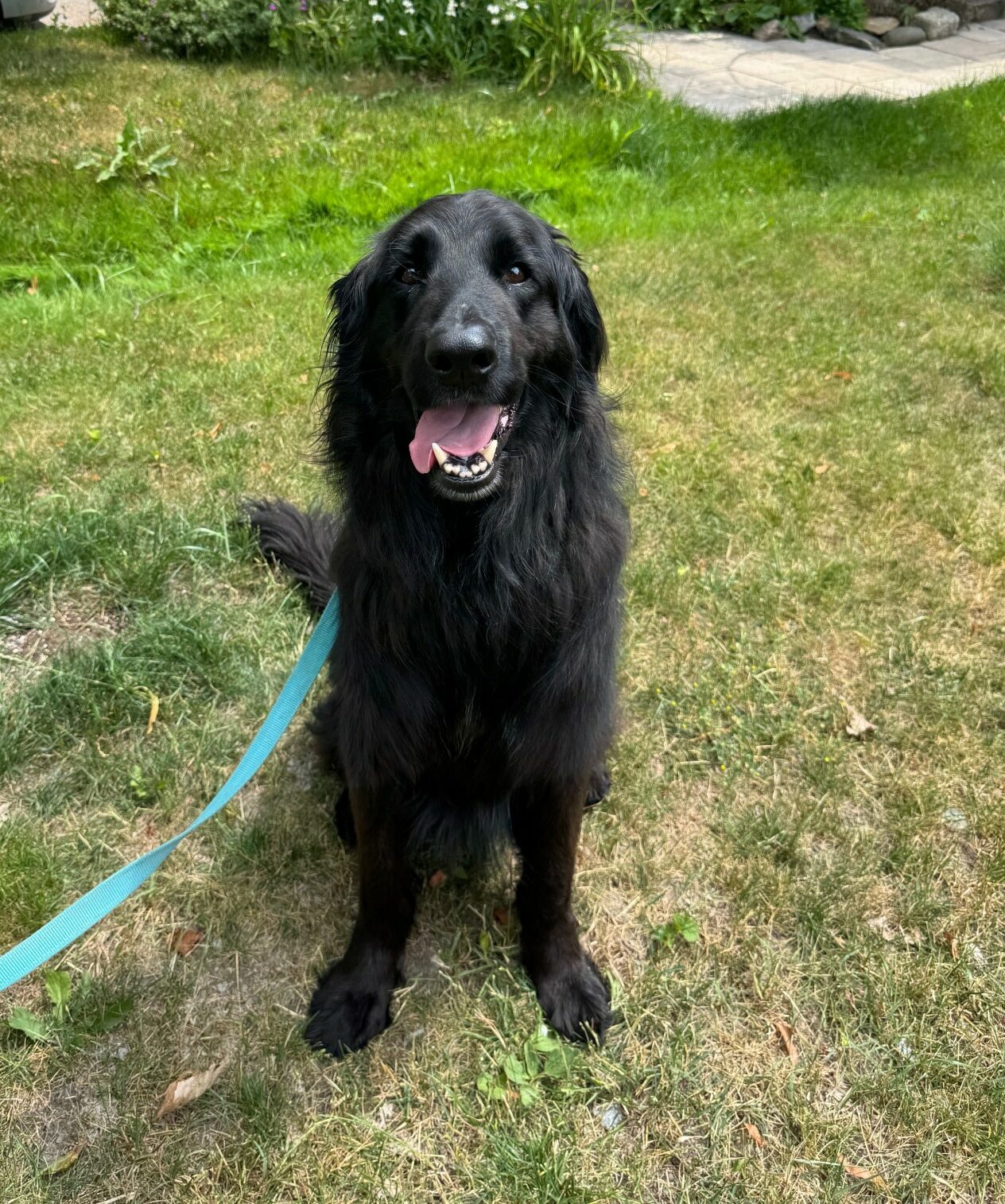 Hi everyone my name is Coal and these are my Coal’s notes…for any of you who remember what those were (ha-ha). I’m a 4-year-old male. You can probably guess that I got the name Coal because of my colour, right? Yes, I’m a Black Golden or what you folks call a ‘Flatcoat Retriever’. When I met the good people at GR, I was pretty much afraid of everything ~ people, other dogs, and life in general. With the help of my amazing guru foster dad, I have come a long way. I love people and realize that everyone only wants the best for me. I am still afraid of other dogs, but I am much better. You can take me out for walks and as long as you keep your distance from other dogs on the street, I’m fine. Speaking of walks, I’m a superstar on the leash, although hanging out in a secure backyard is probably my best thing. I do like being made a fuss over, so you can touch me anywhere. I’m gentle with my treats and you can leave me alone if you have to go out without me. I’ll probably bark in protest for a while but then I settle. I don’t like loud noises, but I don’t freak either. The doc says I’m a healthy boy and she said I’m a good-looking dude…I liked that part the best. My foster dad says: “Coal is a very sweet and loving boy who loves to get love from his humans and would sit by you all day for pets if he could.” I will end with my favourite Coal joke: Did you know that Neil Diamond used to be called Neil Coal…until the pressure got to him. Ha-ha!